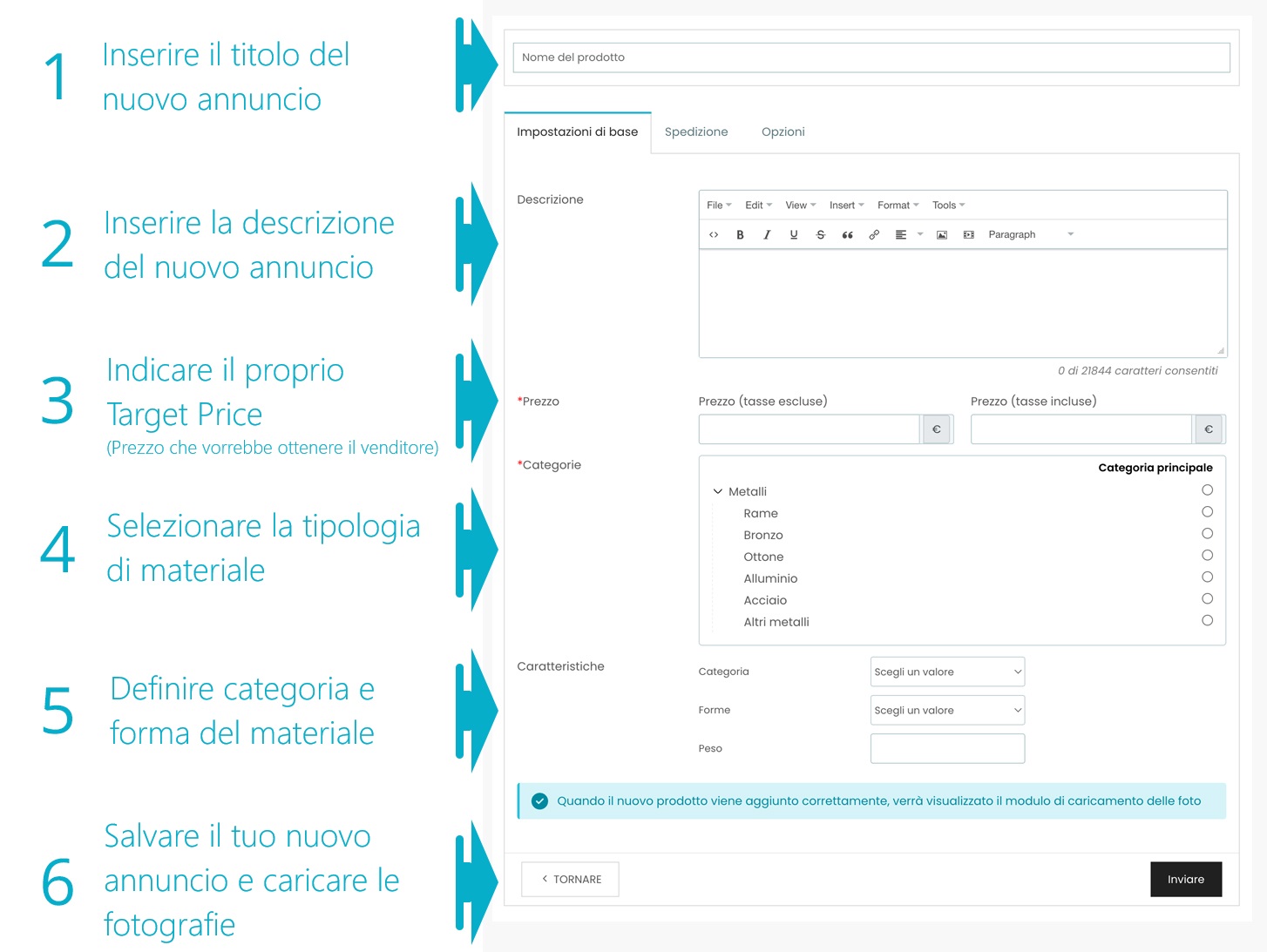Il Venditore dovrà inserire il materiale che vorrà porre in vendita compilando una scheda prodotto che descriva la tipologia di materiale e che contenga informazioni aggiuntive in modo che il potenziale compratore possa essere il più informato possibile sulla merce oggetto di interesse.