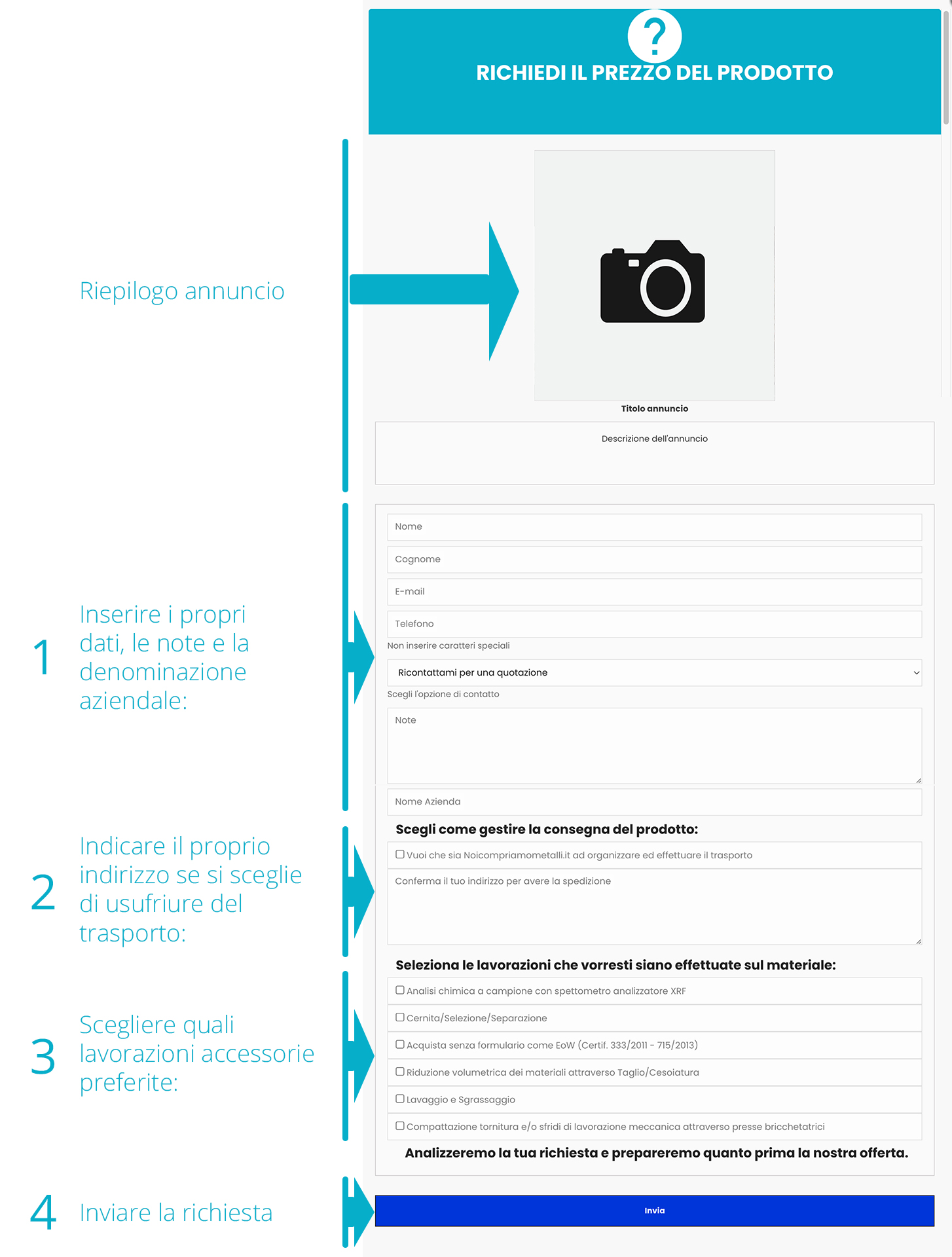 Mediante il tasto “RICHIEDI PREZZO” il compratore potrà accedere alla lista e selezionare le lavorazioni aggiuntive proposte da noicompriamometalli.it; Il compratore dovrà assicurarsi di aver selezionato la lavorazione desiderata prima di inviare la richiesta prezzo. Il nostro Team successivamente valuterà e invierà la migliore offerta.