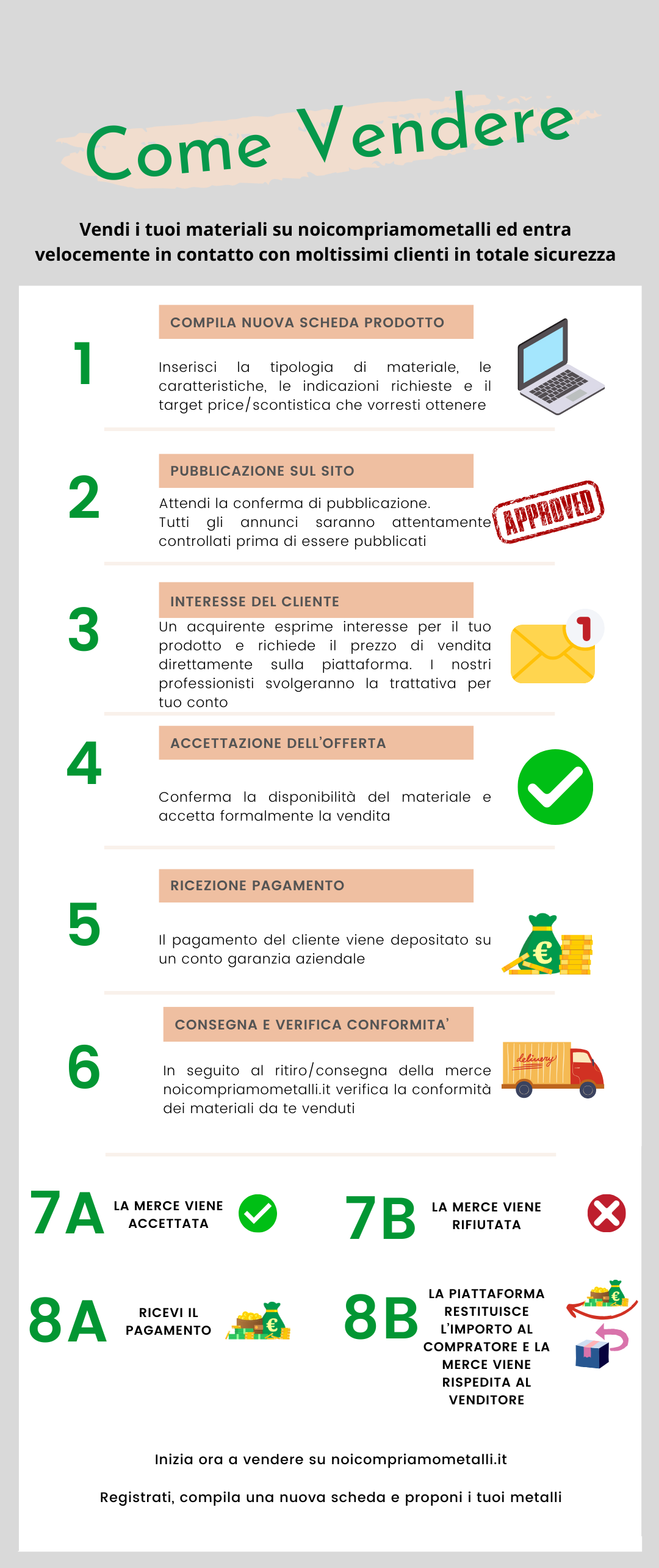 Vendere su noicompriamometalli.it è semplice, immediato e sicuro. Sarete voi a inserire i materiali, decidere il prezzo e proporvi al mercato. Noi tuteleremo le parti e garantiremo la buona riuscita della transazione, verificando la conformità del materiale oggetto di compravendita B2B e i pagamenti.