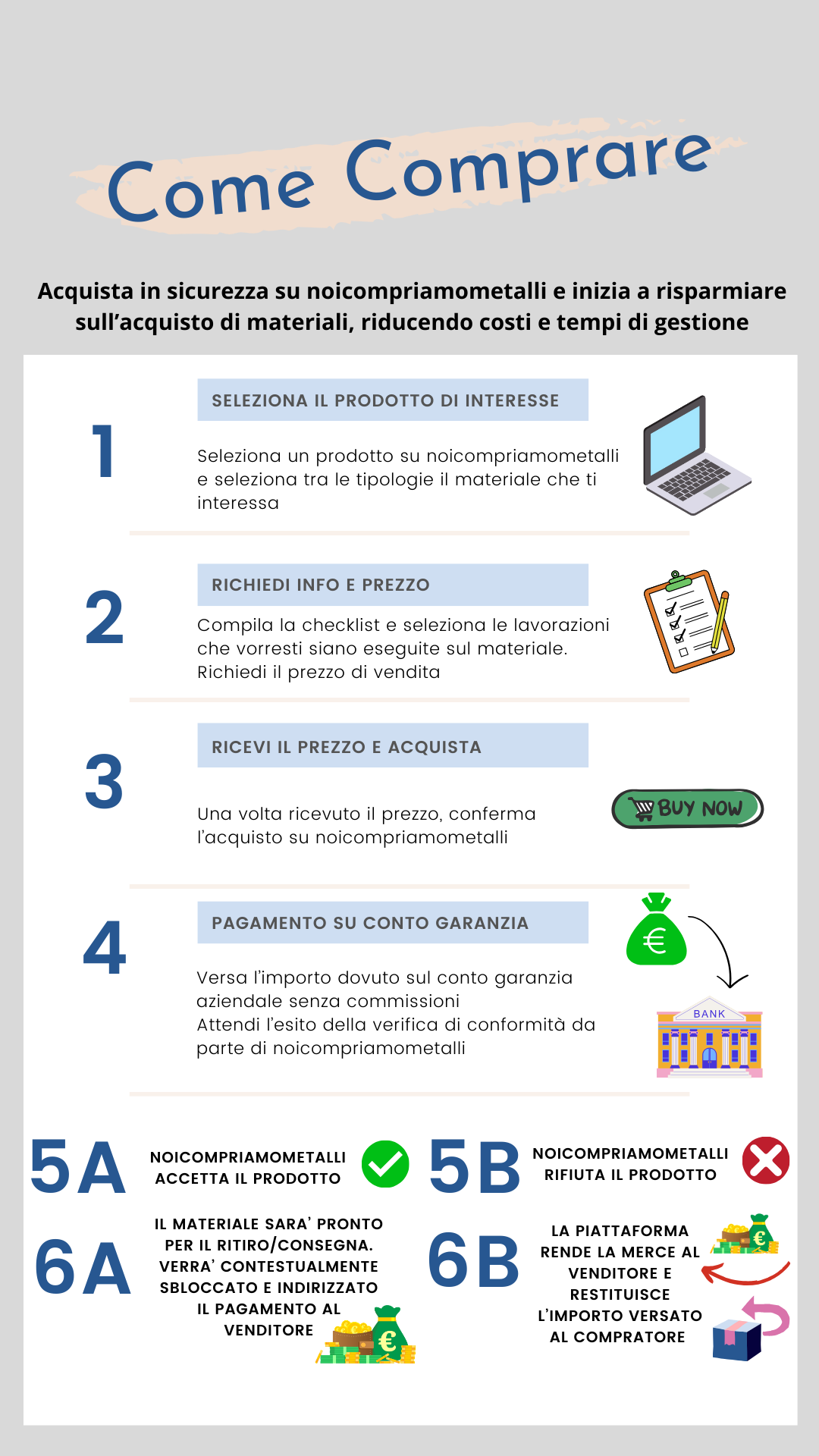 Comprare su noicompriamometalli è vantaggioso poiché permette ampia scelta di materiali. E’ possibile acquistare in pochi click, richiedendo anche lavorazioni accessorie attraverso la compilazione di una checklist. Cercate il materiale di vostro interesse, chiedete il prezzo e quando riceverete risposta potrete accettare e concludere l’acquisto. Gli esperti di noicompriamometalli.it svolgeranno la trattativa per voi.